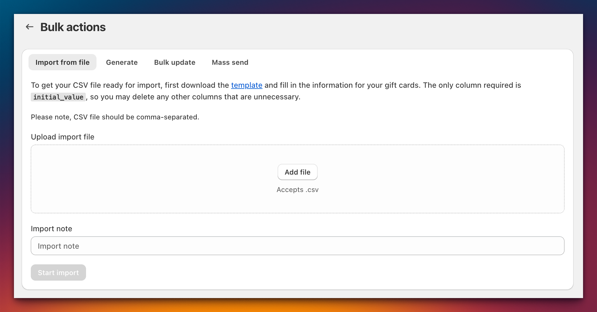 The Bulk Actions feature allows you to create, send, update, or import a large number of gift cards at once by uploading a single file. This saves you significant time compared to managing gift cards one by one. This guide will walk you through how to use the bulk tools to manage your gift cards efficiently.